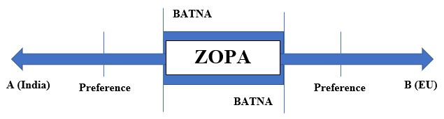 As seen in Figure 1, ZOPA represents the overlap between the party’s reservation prices. A reservation price is the party’s breakeven point or the worst acceptable outcome for each issue.[49] India and the EU must identify the point beyond which an agreement would no longer be beneficial for the parties. Hopmann states that, ‘In order to determine this point, the party must first ask itself what is the value associated with a nonagreement, or in other words, what will happen if the negotiations break off and no agreement is reached.’[50] Therefore, parties may be able to reach a settlement anywhere between the parties’ BATNAs, as seen in Figure 1.